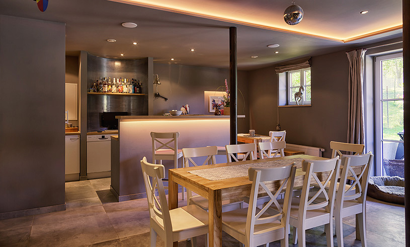 Zu geselligen Treffen lädt unser schickes Reiterstüberl ein - im Winter ist es gemütlich warm und im Sommer kann man auf der Terasse die Sonne genießen. Zur Ausstattung gehört eine Multimedia-Anlage mit TV, eine Küche und Toiletten.
