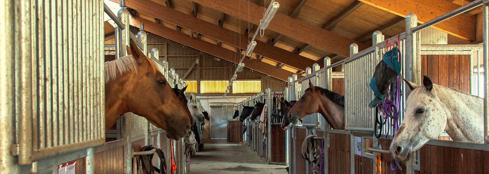 In dem großzügig angelegten Stallgebäude mit hohem Giebel und Lichtfirst sind 19 große Innenboxen (zum Teil mit Fenster) und 6 Paddockboxen untergebracht. Unser Service im Stall beinhaltet 2x täglich Kraftfutter (bei Bedarf 3x täglich) sowie 2x täglich Heu (auch angefeuchtet). Dabei wird die Futterration ganz individuell auf Ihr Pferd abgestimmt. 1 x täglich wird gemistet und mit Stroh neu eingestreut.